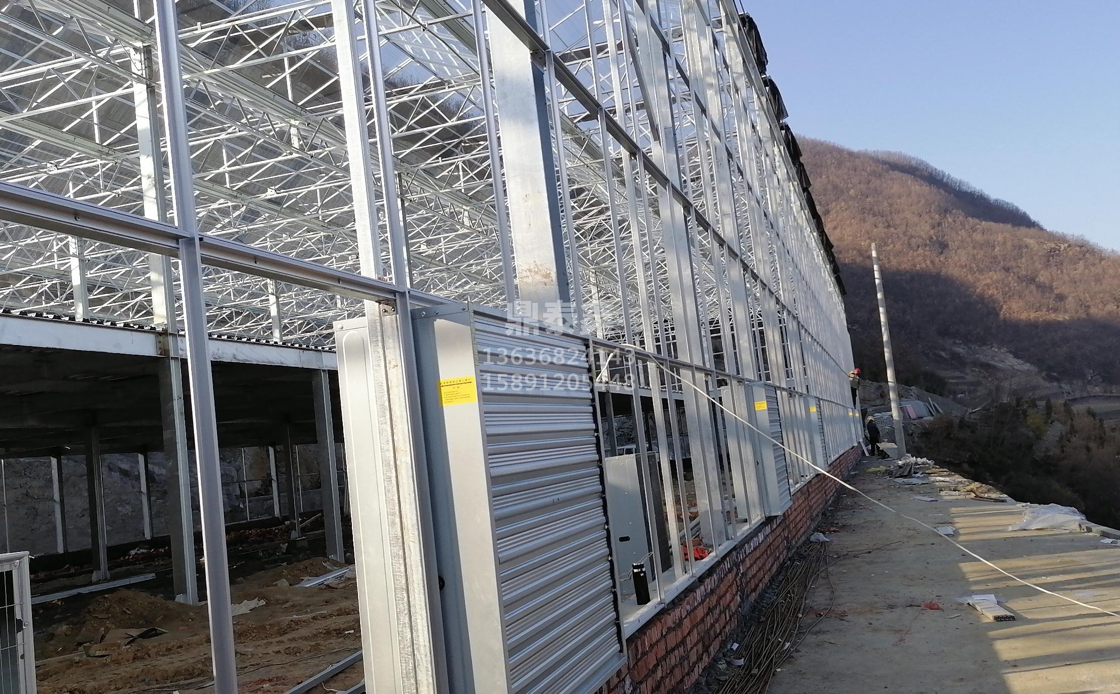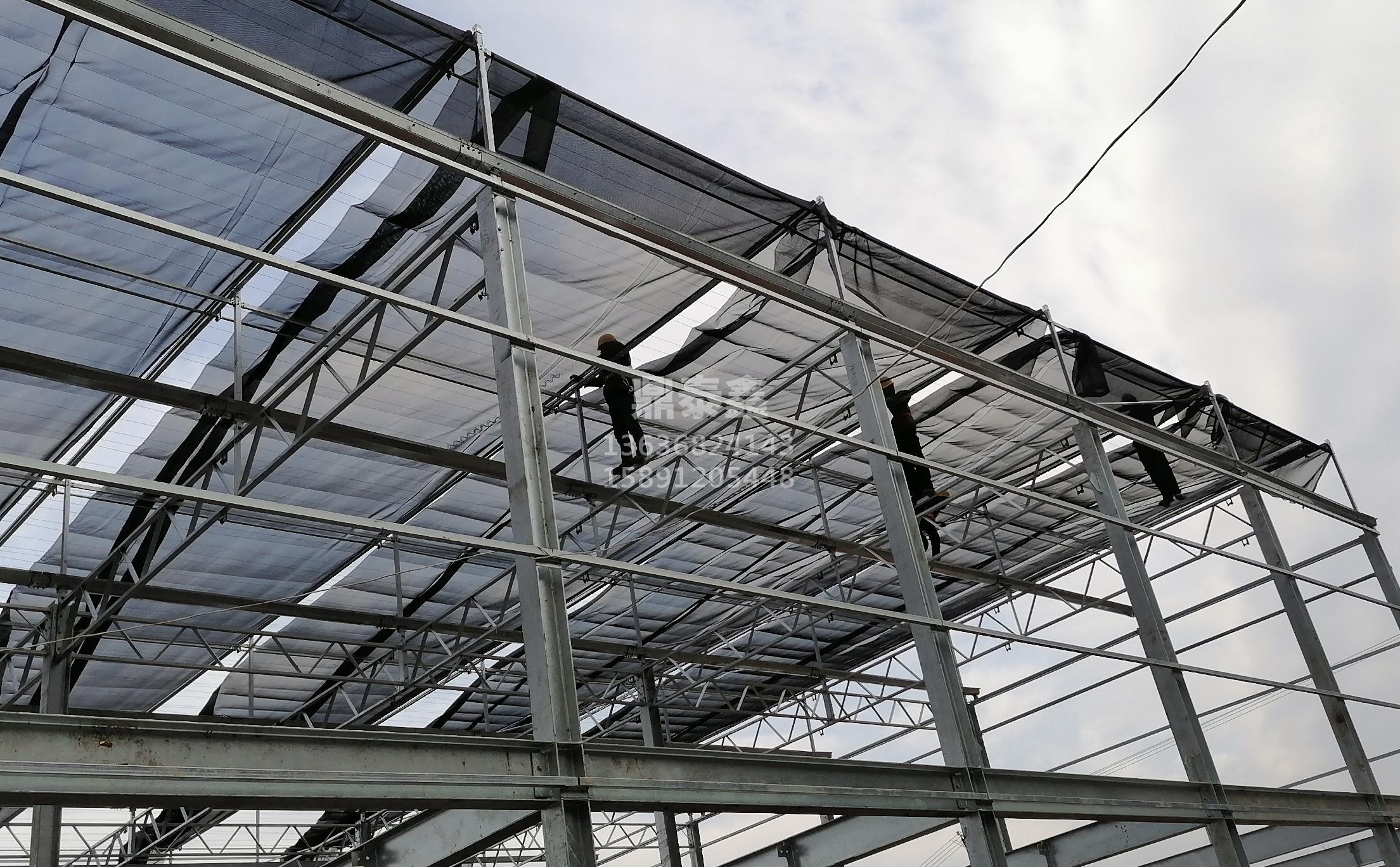 智能温室外遮阳系统在太阳照射较强时,温室大棚内部的温度能保持在一定范围内,使室内的所种植物不致因温度过高而发育不良甚至枯死,温室顶部设有遮阳网。遮阳网采用镀有金属的塑料细绳编织而成,因为有金属光泽,太阳光的辐射热会被反射回去,达到遮阳的目的。遮阳网的张开与收拢,由电机牵引一个闭环的钢丝绳实现。