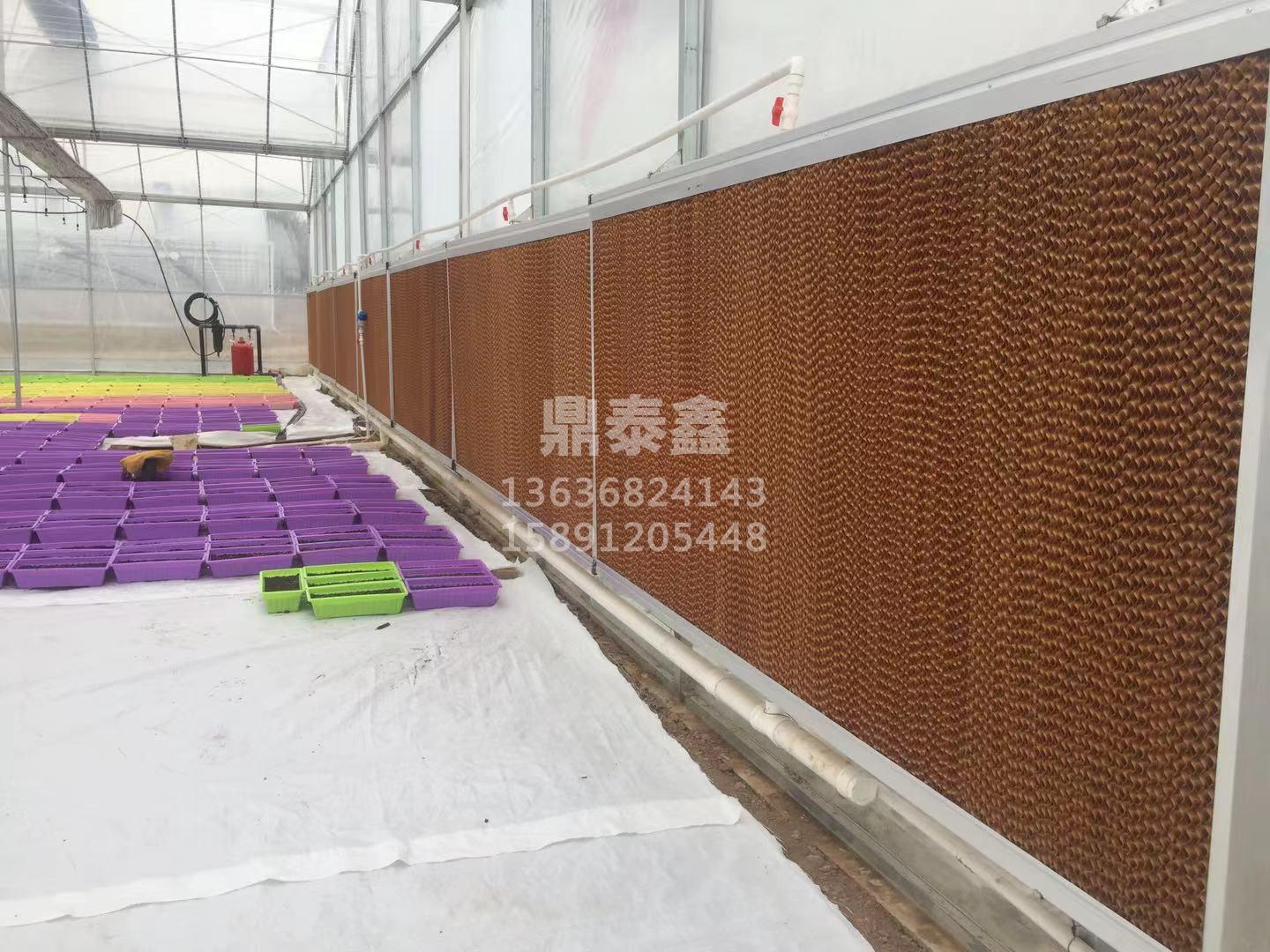 温室大棚*为常见的应该就是风机湿帘强制降温系统了,也是目前温室行业*为经济有效的温室降温系统之一,湿帘和风机分别按照在相对的两侧山墙上,风机排风在温室内形成负压,湿帘侧室外空气通过湿帘进入室内。过帘风速越大换热效率越低,阻力损失越大,相反之,通风量降低能带走的热量减少。湿帘的尺寸选择原则是应使湿帘系统达到好的效果,通常在花卉生产温室中常常使用的是10厘米厚或15厘米厚的纤维湿帘。10厘米厚的纤维湿帘,在通过湿帘的空气速度为76米/分钟时运行效果好,15厘米厚的纸质湿帘则要求空气速度为122米/分钟。若所栽培花卉对温室温度,对高温的耐受能力差,建议使用15厘米厚的湿帘,反之,若温室湿帘和风机间距离较小或者花卉温度程度低,则使用10厘米厚的湿帘。